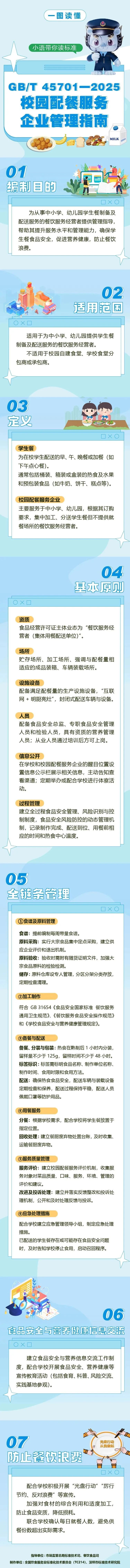 2025年7月,市場(chǎng)監(jiān)管總局批準(zhǔn)發(fā)布《校園配餐服務(wù)企業(yè)管理指南》國(guó)家標(biāo)準(zhǔn)。該標(biāo)準(zhǔn)將于2025年12月1日正式實(shí)施,適用于為中小學(xué)、幼兒園學(xué)生提供學(xué)生餐制作及配送服務(wù)的校園配餐服務(wù)企業(yè),是校園配餐服務(wù)管理首個(gè)國(guó)家標(biāo)準(zhǔn)。
