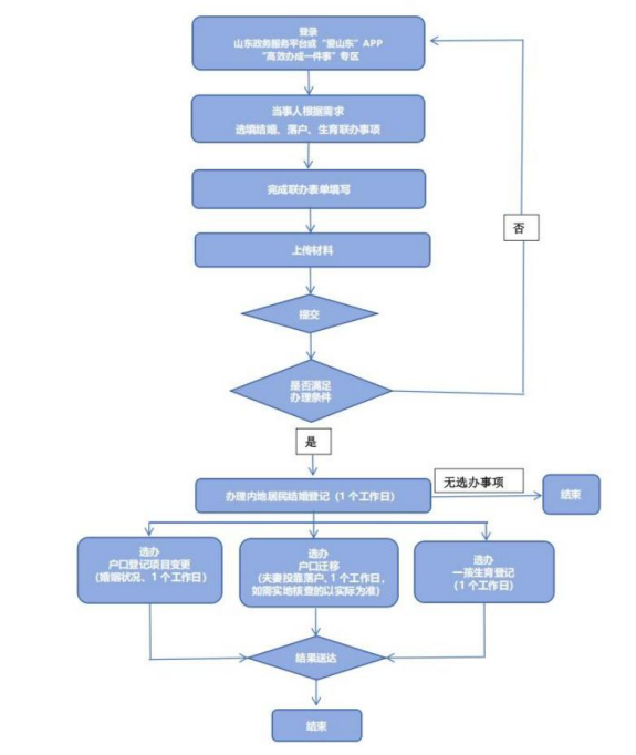 (一)線上辦理。當(dāng)事人可以直接通過登錄山東政務(wù)服務(wù)平臺(http://www.shandong.gov.cn/col/col94091/)“高效辦成一件事”專區(qū)或登錄“愛山東”APP 平臺“高效辦成一件事”專區(qū)進入“結(jié)婚落戶一件事”主題集成服務(wù)模塊,進行結(jié)婚登記網(wǎng)上預(yù)約和戶口登記項目變更(婚姻狀況)、戶口遷移(夫妻投靠落戶)、生育登記的在線申請。